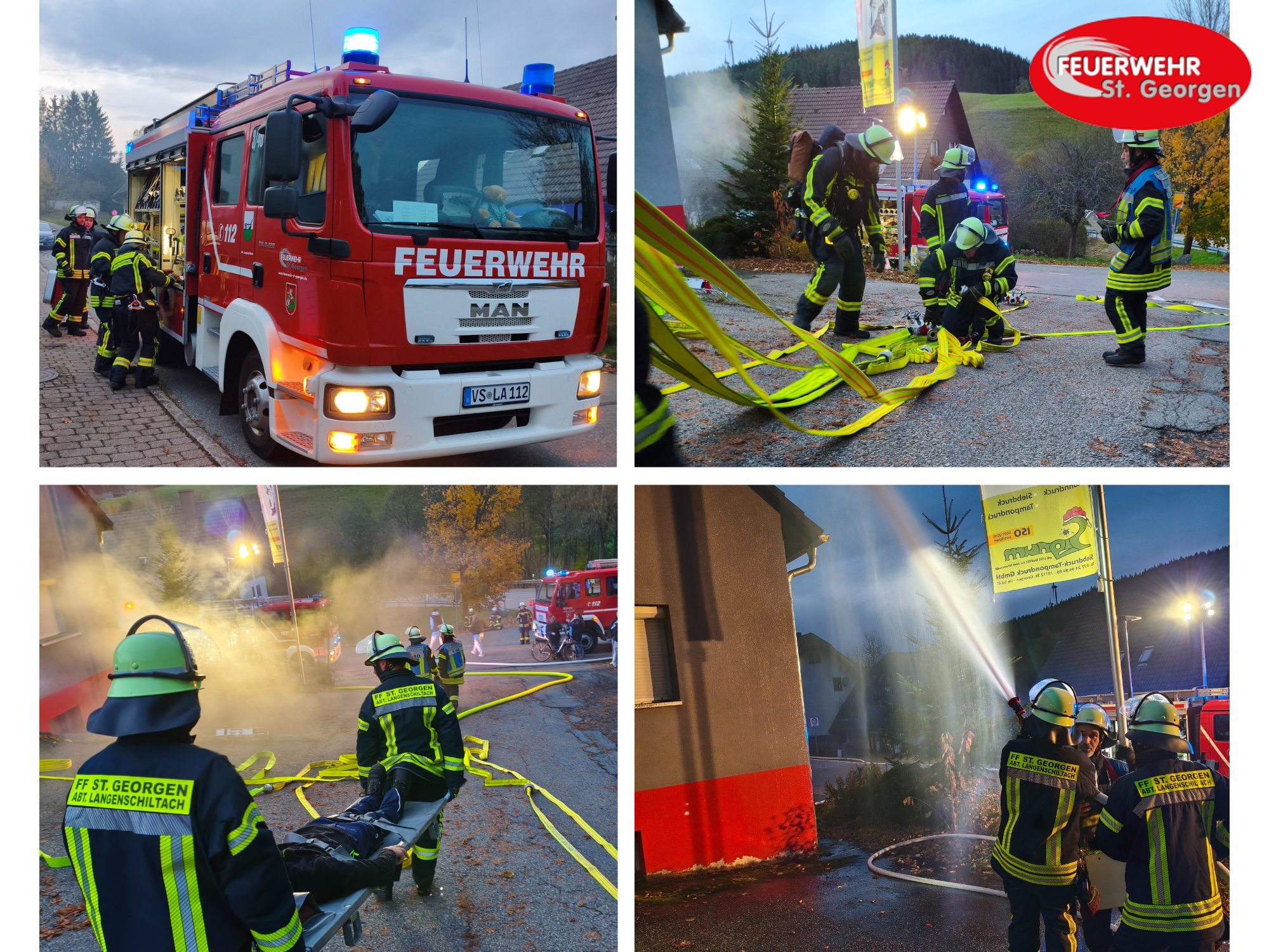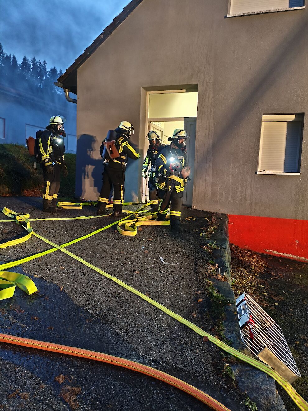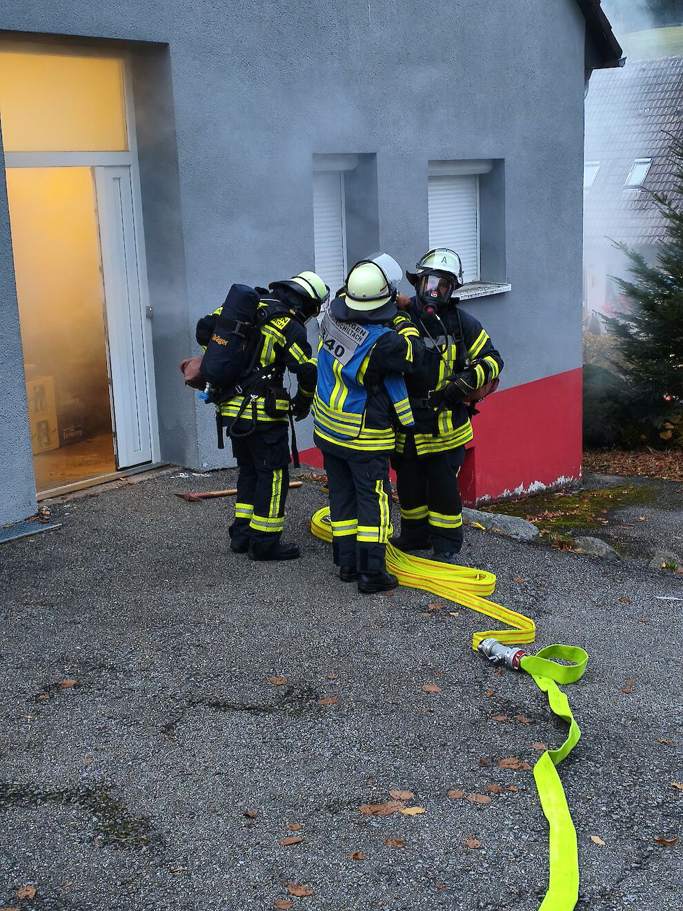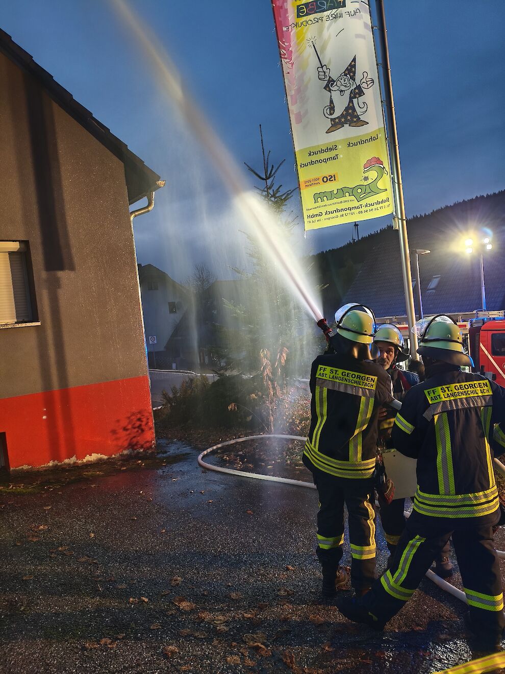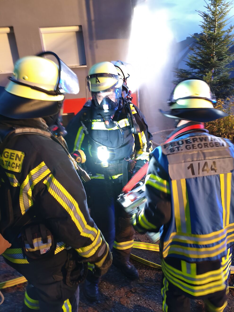 Mehrere Trups mit Atemschutzausrüstung gingen zur Personensuche in das stark verrauchte Gebäude vor. Unterstützung gab es durch das nachgerückte Löschgruppenfahrzeug (LF 16/12) der Abteilung Stadt (Florian St. Georgen 1/44), besetzt mit Kräften der Abteilung Langenschiltach.