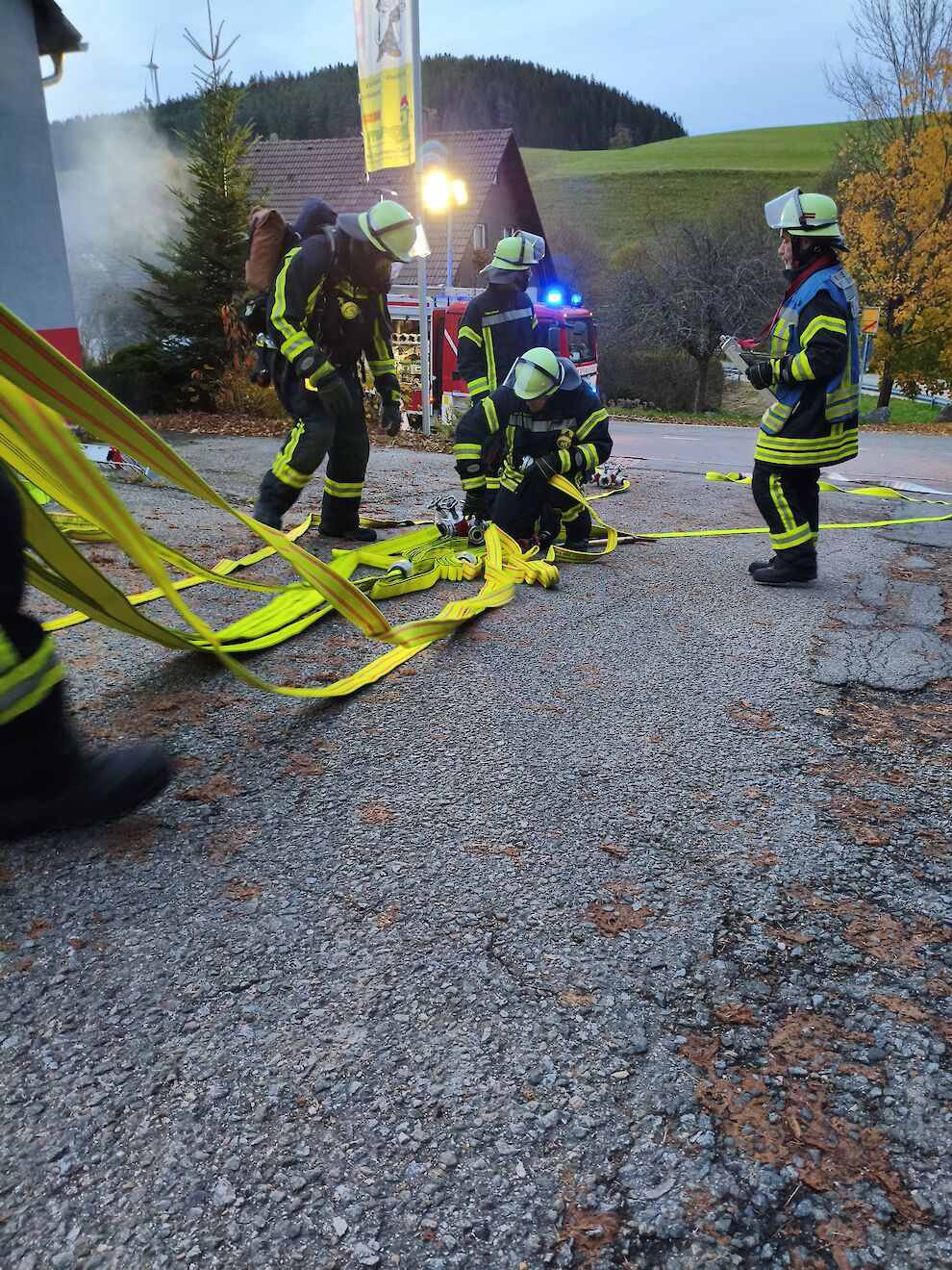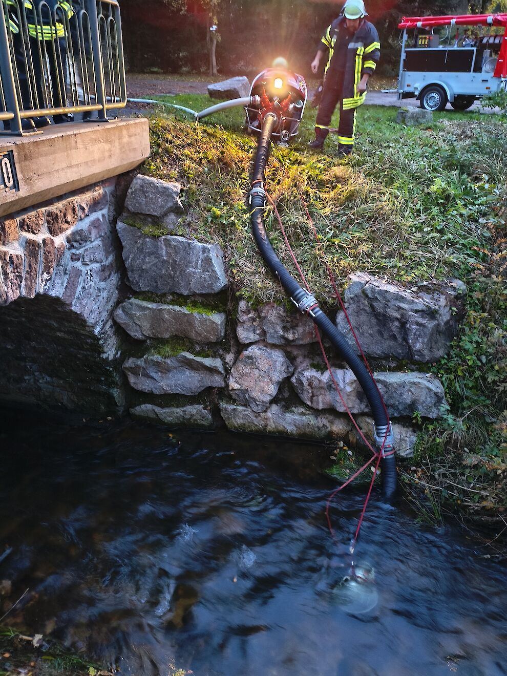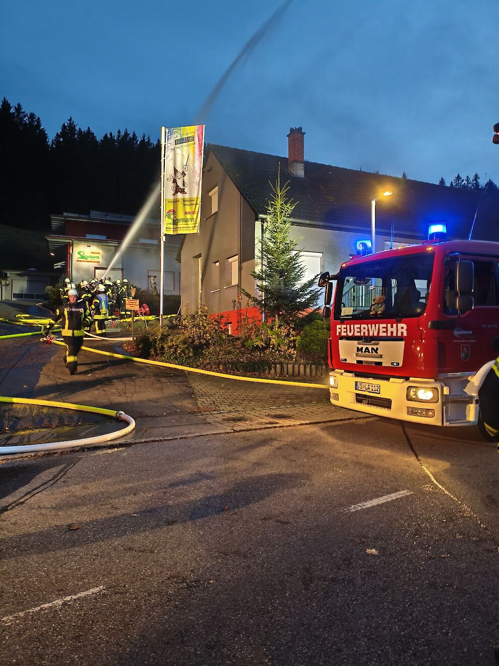 Parallel zur intensiven Personensuche im Innenangriff wurde der Aufbau einer stabilen Wasserversorgung eingeleitet. Hierfür kam der Anhänger der Abteilung Langenschiltach zum Einsatz, mit der auf diesem verladenen Ausrüstung eine Wasserentnahme aus der nahegelegenen Schiltach sichergestellt wurde.
