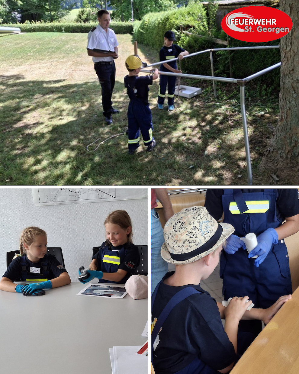 Bei Stationen wie Feuerwehrknoten, Schlauchkunde, Schutzausrüstung, Erste Hilfe, Notruf Absetzen und Verhalten im Notfall ging es heiß her.